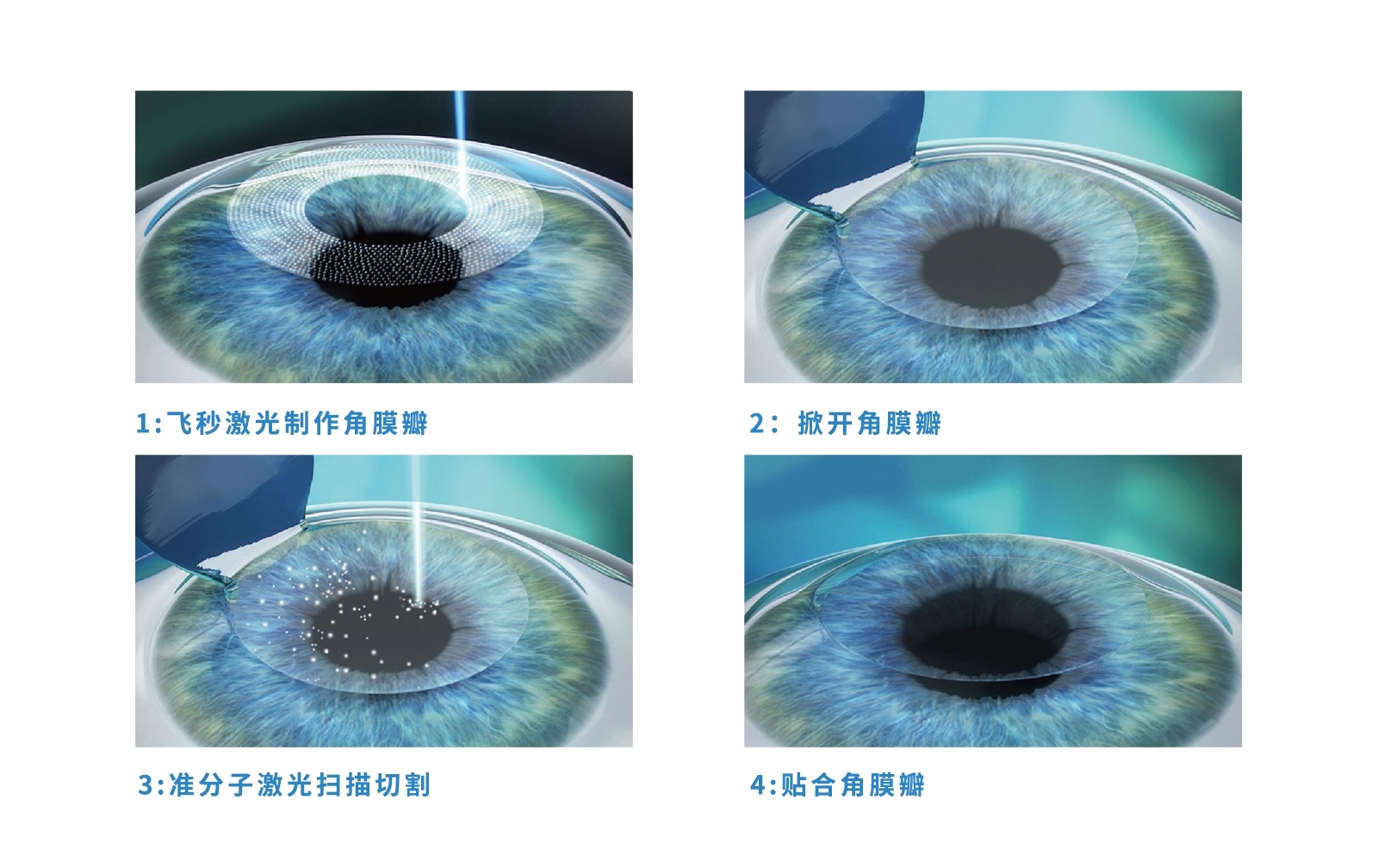 飛秒激光LASIK,又稱(chēng)半飛秒手術(shù)。在手術(shù)中,飛秒激光的主要任務(wù)是制作角膜瓣之后掀開(kāi)角膜瓣,即可在角膜中間的基質(zhì)層進(jìn)行準分子激光切削,用以矯正近視、遠視、散光等屈光不正的一種手術(shù)方式。